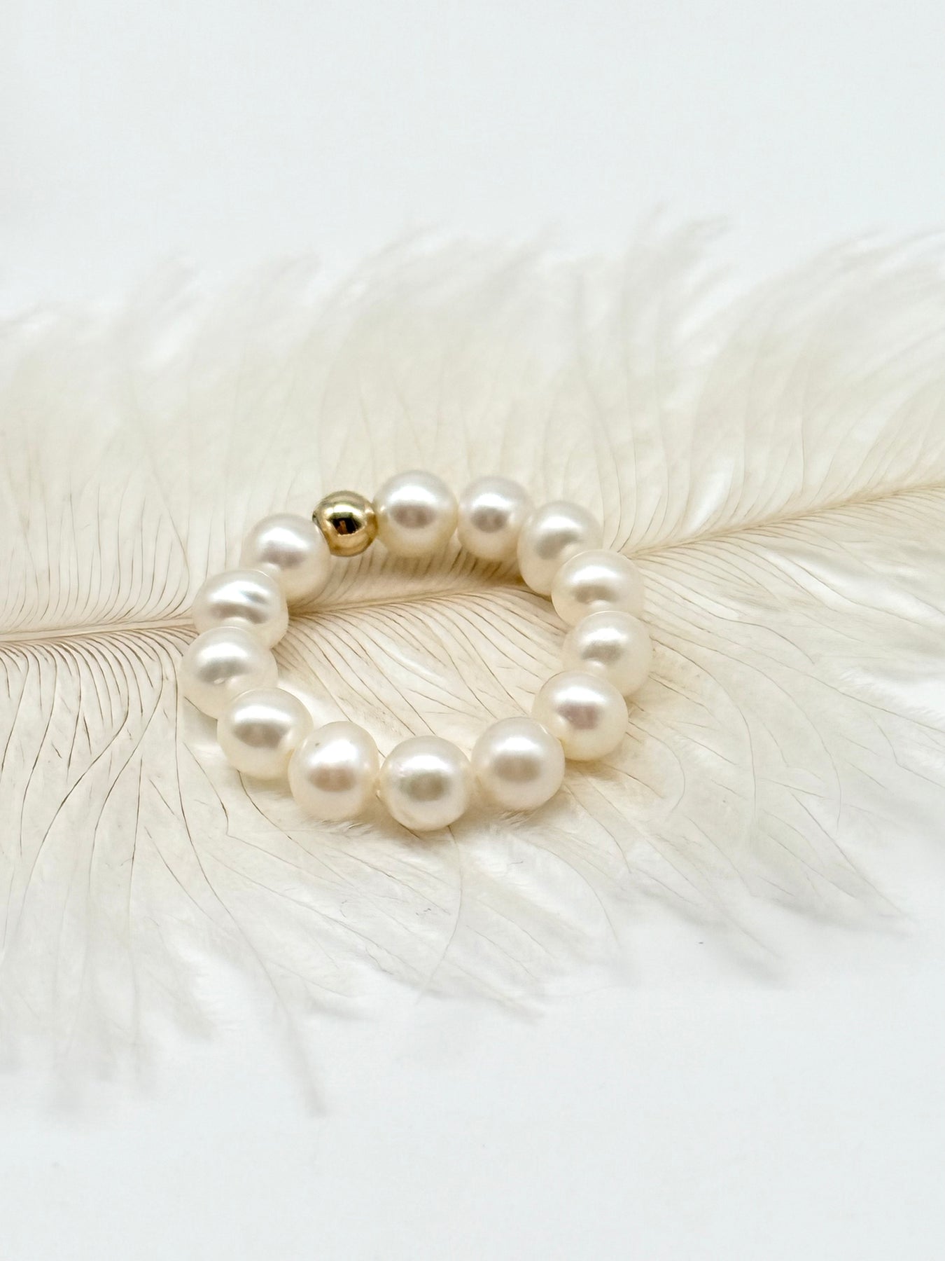 A ring with an enchanting effect: the fine natural white freshwater pearls in button shape surround your finger and emphasize a feminine look, a small gold pearl blends harmoniously into the center. The pearls are strung on a 14K gold filled wire, so the ring is fixed in size.